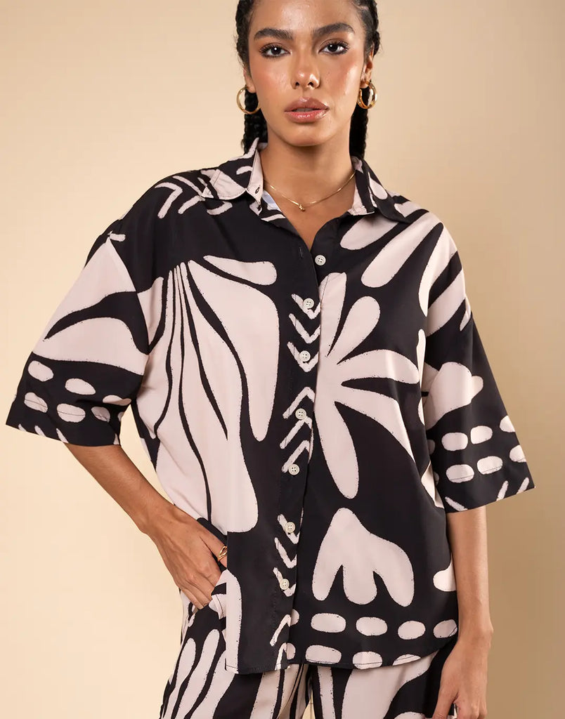 Camisa Manga ¾ con cuello clásico y botones, ligera y fluida. Su diseño suelto permite libertad de movimiento. Ideal para llevar por dentro o por fuera, abierta o cerrada. Úsala en conjunto o por separado.